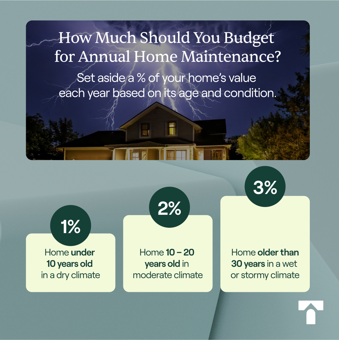 Some experts suggest budgeting 1-3% of your current home value based on your climate and your home’s age and building materials.