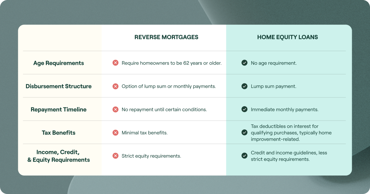 Determining which of these options is for you will start with a deep understanding of the similarities and differences between these loan products. Below, we have broken down five of the key differentiators between home equity loans, home equity lines of credit and reverse mortgages.